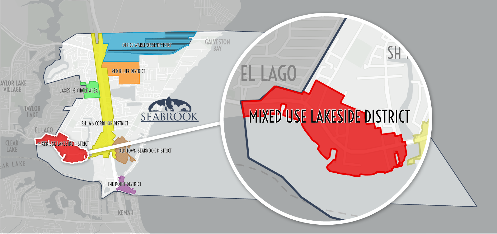 The Mixed Use/Lakefront District encompasses NASA Pkwy, west of the SH 146 intersection, and is ideally suited for mixed-use developments that combine commercial, marine, and waterfront activities. This district is designed to attract tourism through its Waterfront Activity (WAD) zoning, which supports restaurants, retail shops, recreational services, and hotels. As a key entry corridor, the district aims to reflect Seabrook's vibrant community character with enhanced landscaping, improved pedestrian facilities, and better connectivity. Future developments will focus on higher-density retail and residential projects, creating a welcoming and dynamic environment that encourages visitors to explore and enjoy the area.
