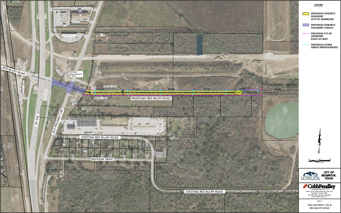 As part of Amendment 2 with the Port of Houston, 4.93 acres were granted to the City of Seabrook near Old SH 146 and Red Bluff. The ROW easement would allow a thoroughfare to be constructed for ingress and egress on parcels north of Red Bluff Road.