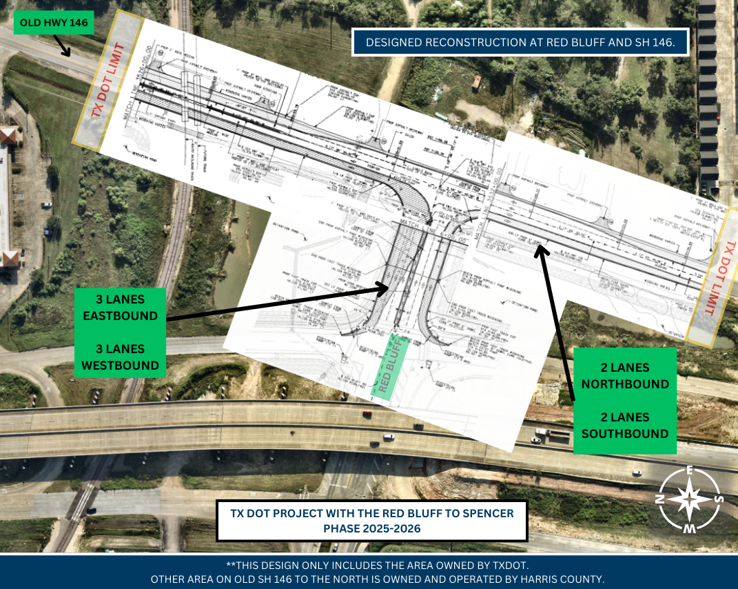 The TxDOT Houston District is proposing design changes to State Highway (SH) 146 from Spencer Highway to Red Bluff Road to improve mobility, reduce congestion, accommodate pedestrians and bicyclists, and enhance hurricane evacuation routes. SH 146, a major corridor connecting Houston to Galveston, currently consists of a four-lane divided freeway with limited access in certain areas. These changes are part of a multi-segment improvement plan that began in the late 1990s. Visit TxDOT's website for detailed project information.