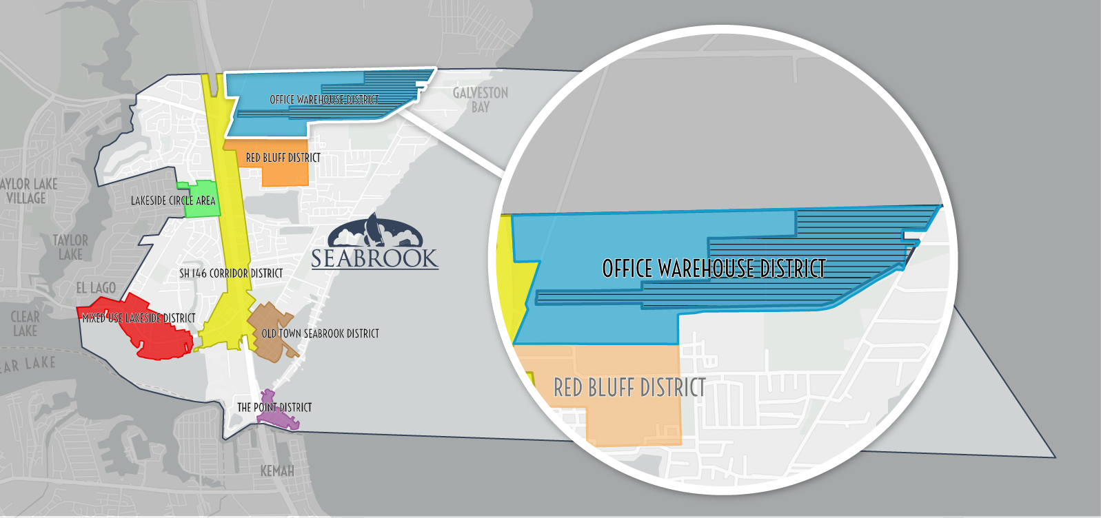The Office Warehouse District, strategically located near the port, offers prime opportunities for office and warehousing developments due to its significant visibility and direct access to SH 146. This area is optimal for office parks and warehouses, which align with the city's vision for attracting industry-supporting businesses while maintaining harmony with adjacent residential and commercial areas. Heavy industrial uses are inappropriate here, and special screening requirements will be implemented to protect nearby residential zones. The district also includes three Industrial Development Agreements (IDAs) with the Port, Baystar, and Ineos.