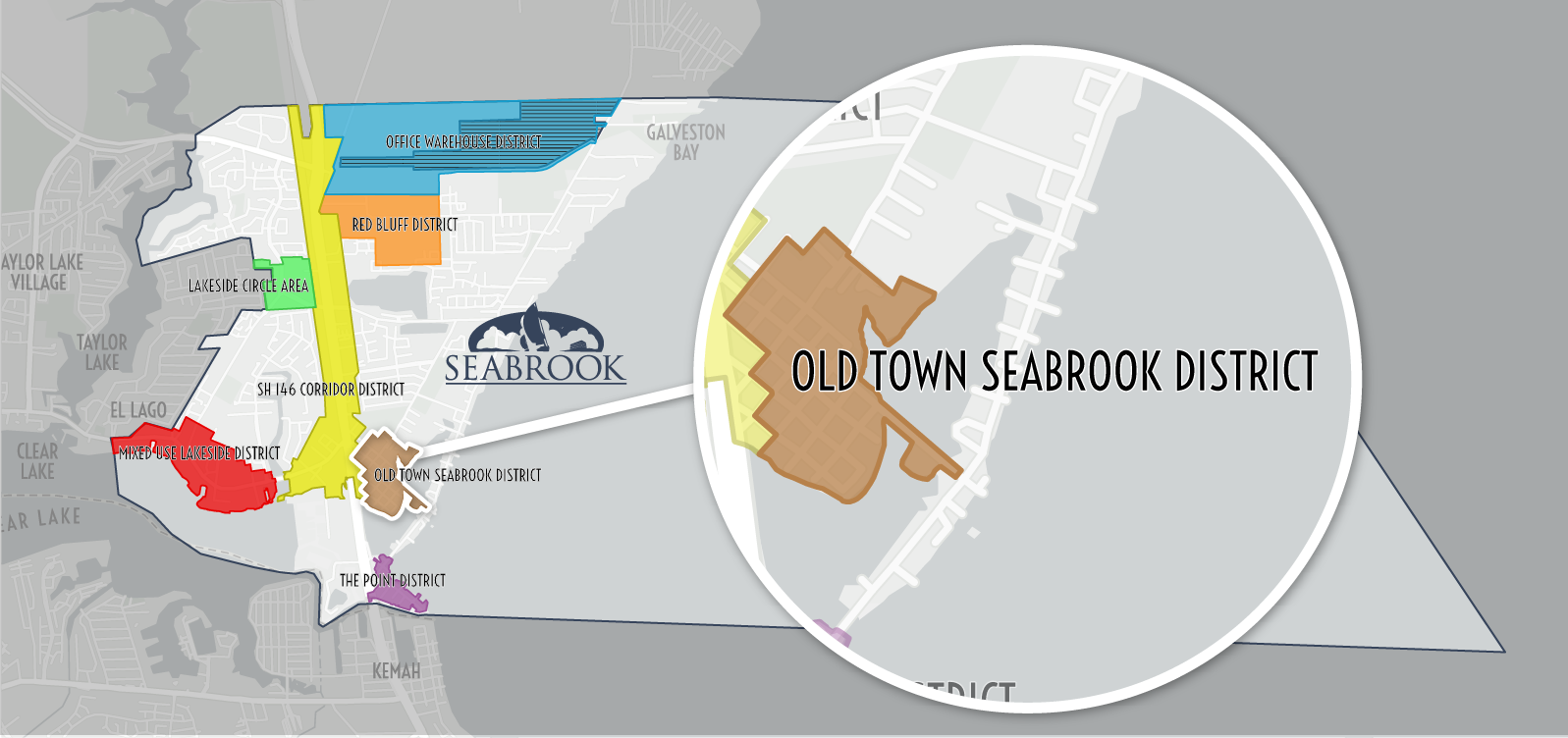 The Old Downtown Seabrook District is a charming area that preserves the city’s historic character with original and historically designed buildings, small blocks, and narrow streets that create a welcoming, pedestrian-friendly environment. This district is home to local restaurants, retailers, and services, with zoning that supports low-density, low-traffic uses, making it an ideal small commercial center and tourist destination. The City is committed to balancing safety regulations with the seaside town theme, ensuring new and existing structures blend seamlessly to maintain the district's unique character. Specific zoning regulations will focus on street design, landscaping, and exterior appearance to promote pedestrian-friendly development. The area is designed to stand out from other entertainment districts, offering a unique sense of place for community gatherings, events, and specialty businesses. The Old Seabrook Livable Center Study, adopted in 2021, aligns with the district's vision and goals, guiding future development to enhance its role as a vibrant community hub.
